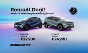 Πρόκειται για τα Renault Captur και Renault Symbioz με τεχνολογία Full Hybrid E-Tech στην εξοπλιστική έκδοση Evolution με ένα πλήρες πακέτο εξοπλισμού άνεσης, ασφάλειας και συνδεσιμότητας. Πιο συγκεκριμένα, το Renault Captur Evolution Full Hybrid 160 ίππων προσφέρεται στην τιμή των €22.900, ενώ το Renault Symbioz Evolution Full Hybrid 160 ίππων προσφέρεται στην τιμή των €24.900. Και τα δύο μοντέλα προσφέρονται με αυτόματο κιβώτιο ταχυτήτων και επτά χρόνια εργοστασιακή εγγύηση.