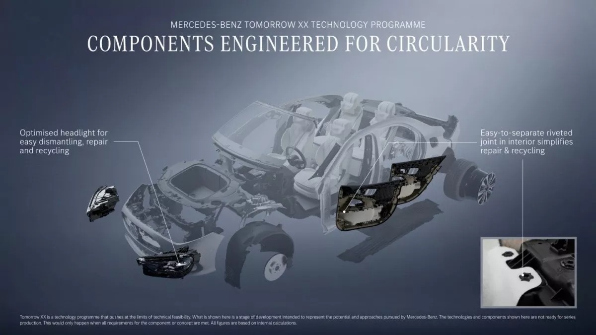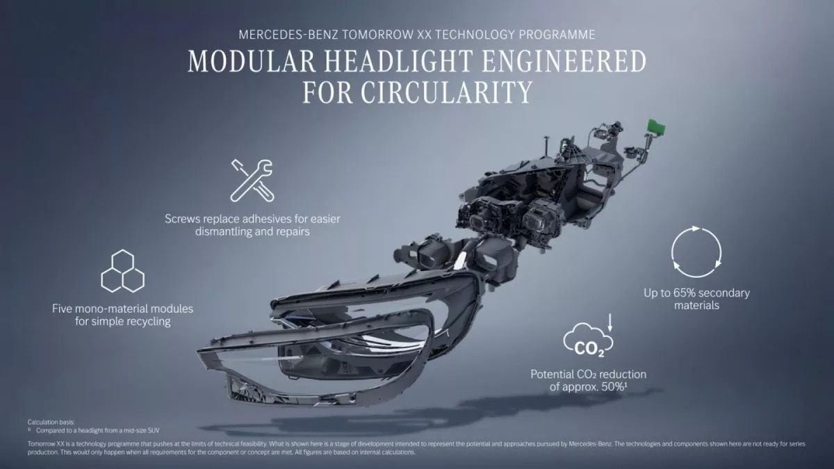 Στο πλαίσιο της πρωτοβουλίας βιωσιμότητας Tomorrow XX, η Mercedes-Benz εξετάζει την επιστροφή σε μια πιο απλή λύση: τις βίδες. Έτσι, τα εξαρτήματα μπορούν να αποσυναρμολογούνται εύκολα, επιτρέποντας την αντικατάσταση ενός φθαρμένου μέρους χωρίς να καταλήγει ολόκληρος ο προβολέας στα απορρίμματα. Το αποτέλεσμα είναι μεγαλύτερη διάρκεια ζωής, λιγότερα απόβλητα και χαμηλότερο αποτύπωμα άνθρακα.