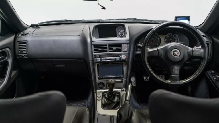 Στο εσωτερικό, το Skyline GT-R διατηρεί τα αυθεντικά bucket καθίσματα της έκδοσης M-Spec, επενδυμένα με μαύρο δέρμα, ενώ υπάρχει και μια διακριτική αναβάθμιση με σύγχρονη μονάδα πολυμέσων Eclipse. Η συνολική εικόνα μαρτυρά προσεγμένη χρήση και σωστή συντήρηση.